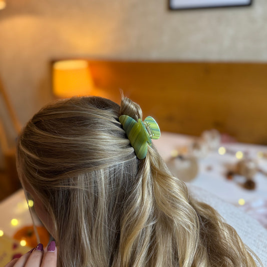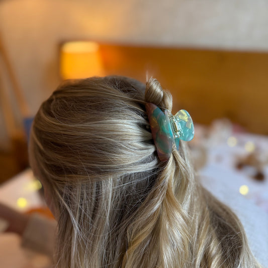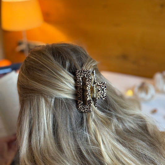 Elegante Haarklammern aus hochwertigem Acetat, in verschiedenen Größen – von klein bis XXL, perfekt für feines, normales oder dickes Haar. Dazu passende Taschen in warmen Braun-, Karamell- und Beigetönen, die Stil und Funktionalität vereinen.