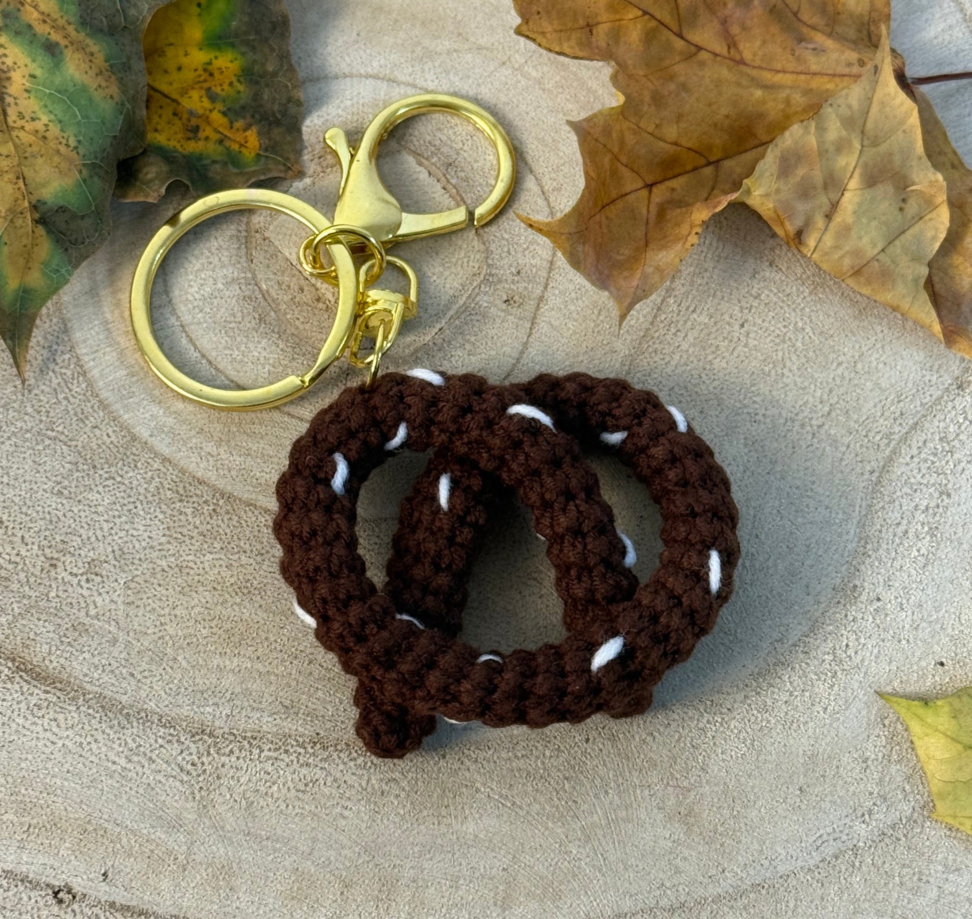 Dieser farbenfrohe Anhänger in Brezel-Optik wird aus weicher Baumwolle handgefertigt. Perfekt als Taschenanhänger, Schlüsselanhänger oder sommerliches Accessoire.