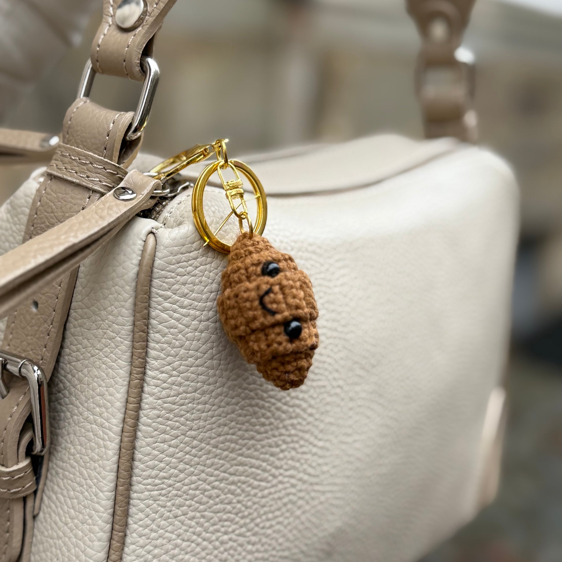 Dieser farbenfrohe Anhänger in Latte Macchiato-Optik wird aus weicher Baumwolle handgefertigt. Perfekt als Taschenanhänger, Schlüsselanhänger oder sommerliches Accessoire.